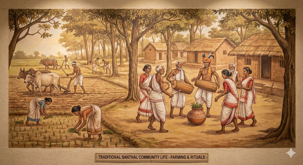 The Santhal community is one of the largest and most prominent indigenous Adivasi communities of eastern India, with a rich heritage rooted in harmony with nature, collective living, and strong moral values. Their society is guided by customs, oral traditions, music, dance, and a deep respect for land and forests. Social equality, community decision-making, and mutual support form the foundation of Santhal life.